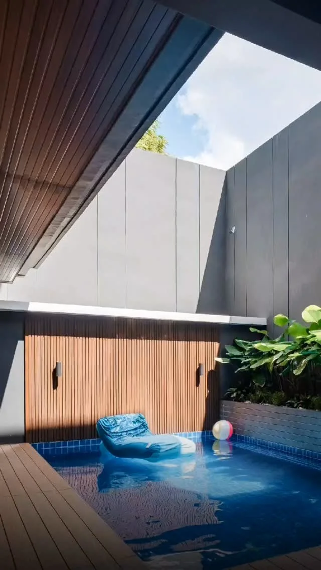 Modern outdoor pool with wooden deck, inflatable lounge chair, potted plants, and privacy wall.